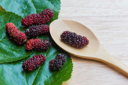 Mulberry in spoon on a wood plant, mulberry have Red and black color and berry fruit good health