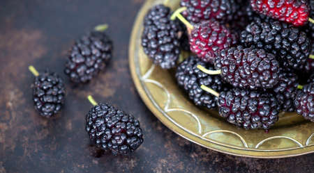 Mulberry fruits, healthy sweet dessert in golden plate, food banner