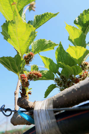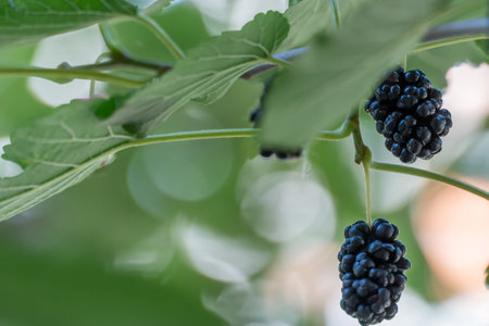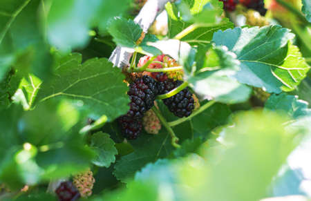 Ripe mulberry fruit on the branch in organic orchard, selective focus