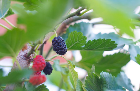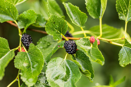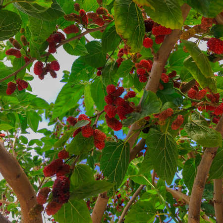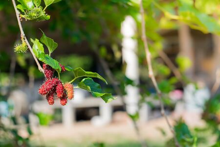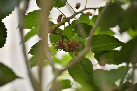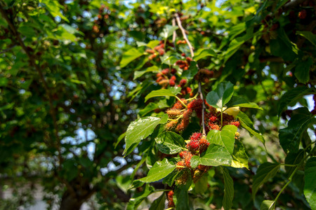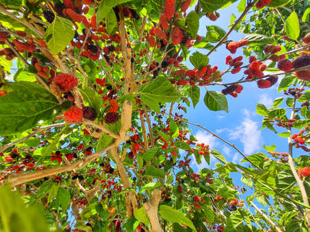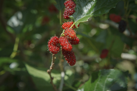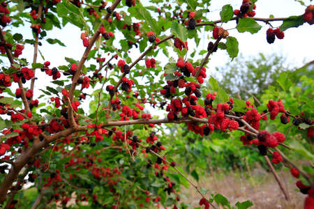 Mulberry berries on mulberry tree branches, red mulberry fruit