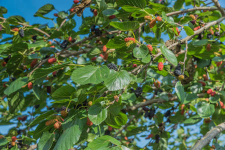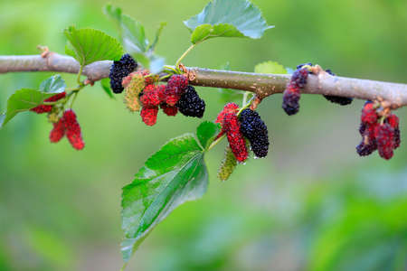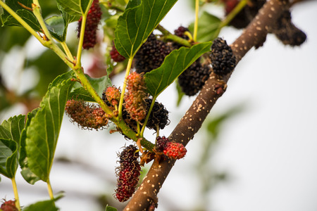 Mulberry fruit and tree. Black ripe and red unripe mulberries tree on the branch