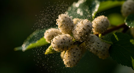 A close-up shot of ripe white mulberries on a tree branch, glistening with water droplets, highlights the freshness and natural beauty of the fruit.