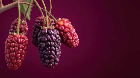 This image features fresh berries hanging from a branch against a vibrant purple background. Ideal for promoting healthy eating, cooking inspiration, and farm-to-table concepts.
