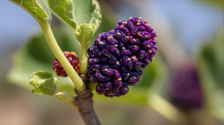 A close-up of fresh, ripe mulberries on the branch, with their deep purple color and delicate texture highlighted against lush green leaves.