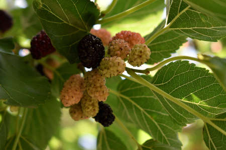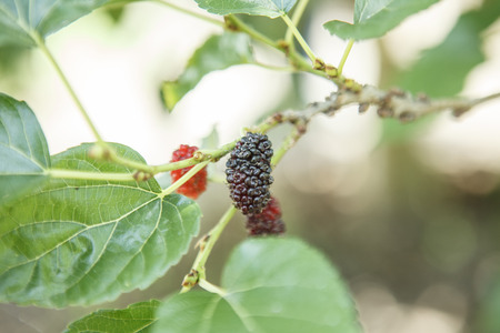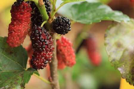 Mulberry fruits on tree, Mulberry with very useful for the treatment and protect of various diseases, Organic fresh, ripe fruit.