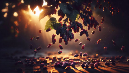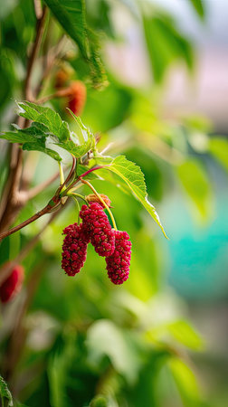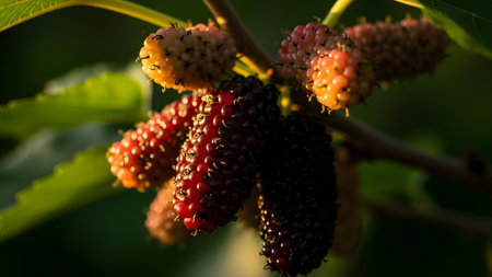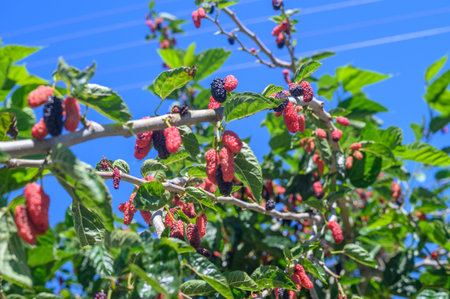 Ripening mulberries hang from lush green branches, showcasing bright red and black hues against a sunny backdrop.