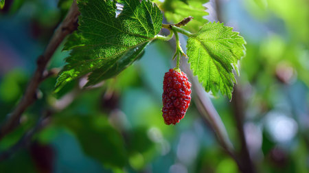 A sunlit portrait of a single Mulberry red, photographed outdoors on a clear, breezy day. Fresh, crisp air renders vivid detail in the leave veins glowing with gentle backlight. The background falls into a soft natural bokeh of greenery, colors true-to-life, organic beauty in pure sunlight.