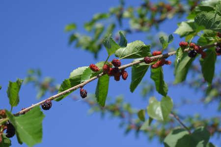 mulberry blacks. Branch with blacks and red fruits on the background blue sky.