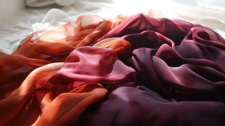 This image features a beautiful arrangement of colorful sheer fabrics draped softly on a surface, illuminated by natural light, creating an ambiance of elegance and serenity.