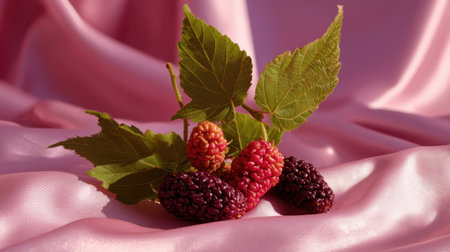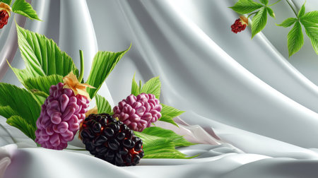 A visually appealing arrangement of fresh mulberries with green leaves on smooth satin fabric, perfect for culinary and food photography inspiration.