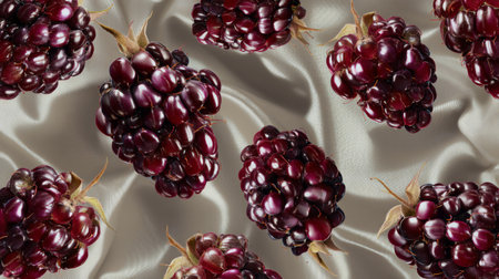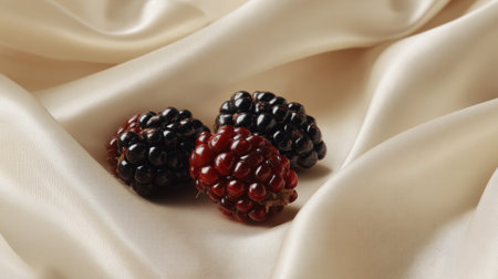 Three fresh blackberries rest elegantly on soft satin fabric, showcasing rich colors and textures. Perfect for culinary and lifestyle themes, evoking freshness and style.