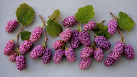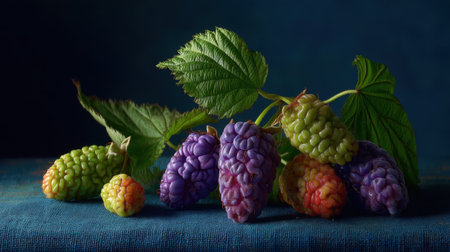 A captivating still life of fresh mulberries on a branch with vibrant green leaves, showcasing their natural beauty and promoting healthy eating choices.