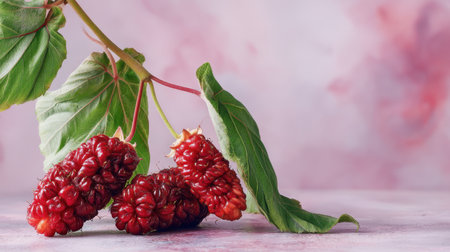 This image showcases fresh red mulberries with lush green leaves against a soft pink background, highlighting the beauty of nature's bounty in a simple, artistic arrangement.