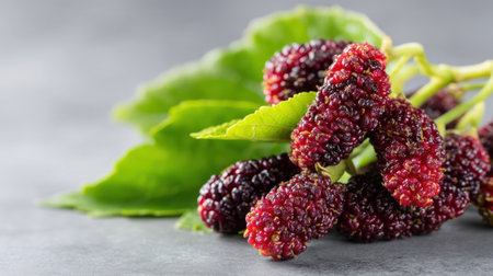 This image captures the beauty of fresh ripe mulberries, showcasing their juicy texture and vibrant color against a gray background with green leaves.