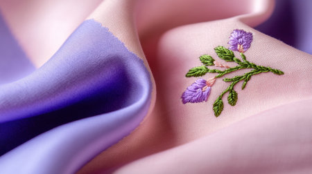 Soft pastel fabric swatches in lavender and pink with floral embroidery, ideal for textile design and home decor