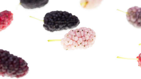 Ripe and unripe fruits of the mulberry tree, before a white background Photo taken on 15 April 2014