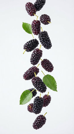 Mulberries falling vertically, white background, deep rich color, crisp macro detail.