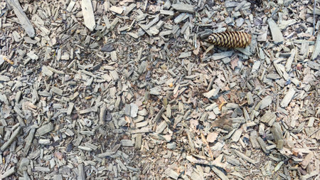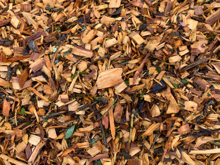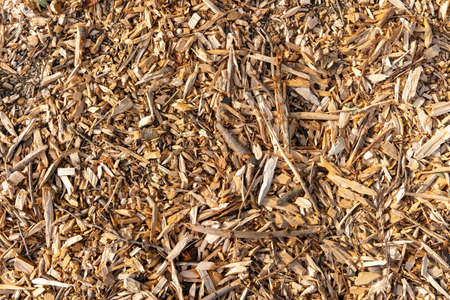 Wood chips closeup on the ground.