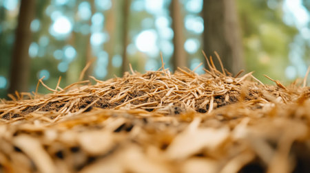 A stunning close-up view of wood chips strewn across the forest floor, illuminated by soft sunlight filtering through the trees, showcasing the serene beauty of nature.