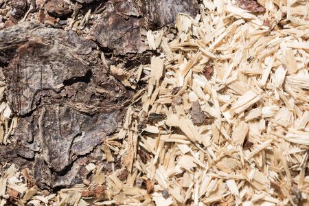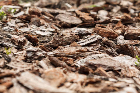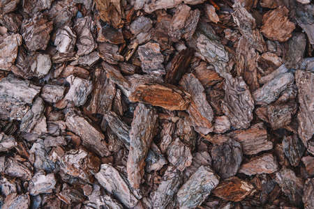 Tree bark for decoration and mulching in landscape design. Crushed tree bark texture background closeup.