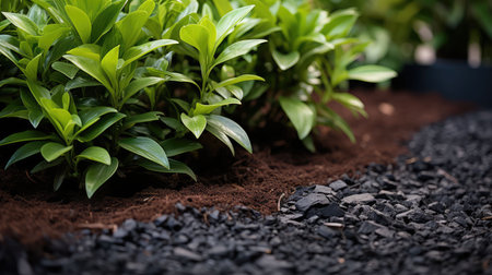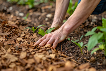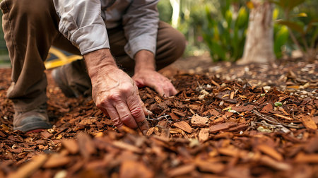 Hands mulching soil with bark chips in garden, mulch closeup, crushed wood pieces, blurred background, copy space for text, generative AI illustration