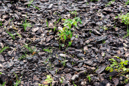 A low angle shot of young plants growing amongst wood chips in a forest.