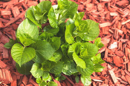 focus on green leaves with decorative red mulch under, note shallow depth of field