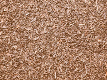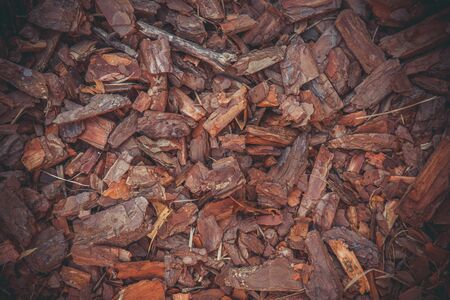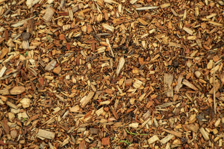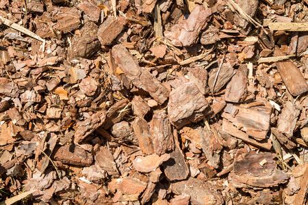 Crushed tree bark texture background closeup. Shredded brown tree bark for decoration and mulching or for playground.
