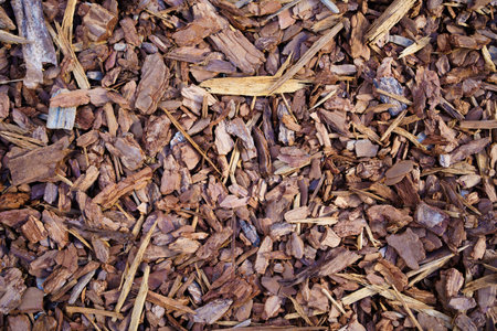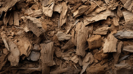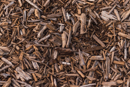 Close-up texture of natural brown wood mulch with bark chips and organic debris, showing rough surfaces and earthy tones for backgrounds and nature design elements. Top view.