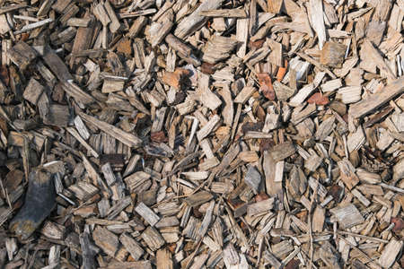 Abstract background and texture of sawdust and pieces of wood. Texture, pattern, frame, copy space. Brown or gray mulch used for gardening, landscape decoration