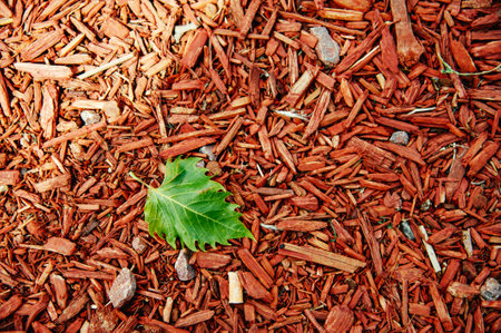 A small green leaf lies on a pile of red mulch.