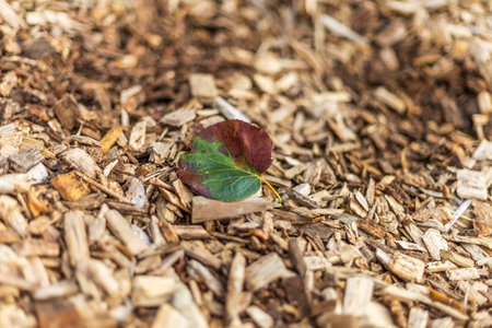 Decorative wood chips with autumn leaves. The slivers are red, the leaves are yellow.