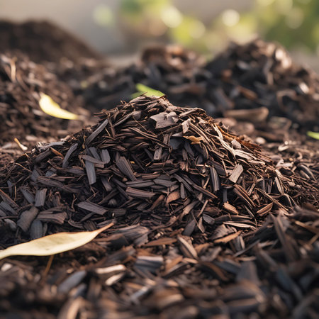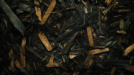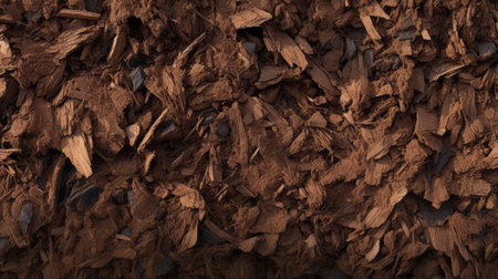 A detailed view of dark organic mulch featuring a mix of wood chips and shavings. This natural texture is perfect for enhancing landscapes and gardens, offering a sustainable aesthetic.