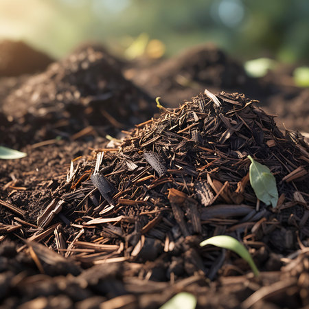A detailed, close-up perspective of rich garden soil mixed with dark wood chip mulch. Tiny green shoots and leaves are emerging from the soil and mulch, indicating new plant growth. The texture of the soil and the shredded wood is prominent. Sunlight filters through, casting a warm light on the scene, with blurred mounds of soil and foliage in the background. This image captures the essence of fertile ground ready for planting.