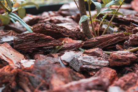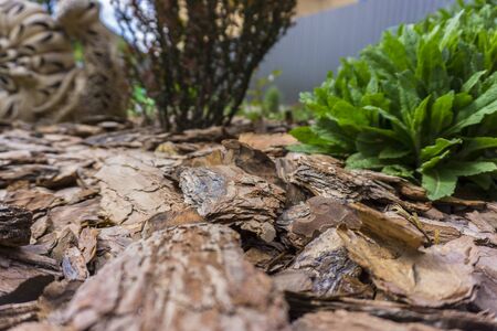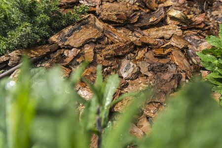 Mulch made of wood bark. Mulching is an agrotechnical way of covering the soil