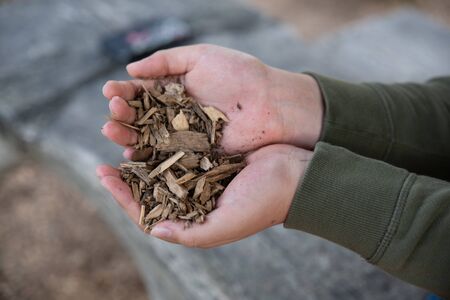 A handful of wood chips from a hiking trail