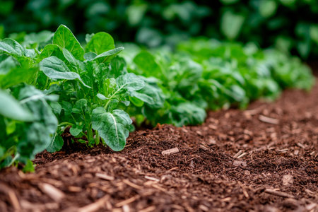 Lush spinach plants sway gently in the breeze, their vibrant green leaves reaching for sunlight above rich, dark soil. This thriving garden showcases the essence of healthy growth and nurturing care.