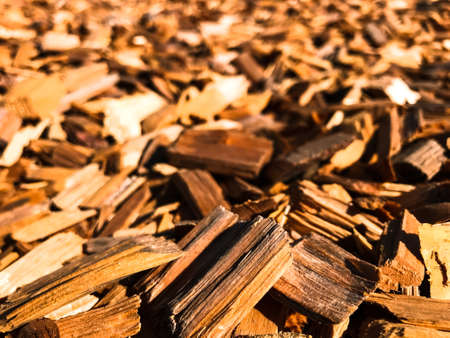 Wood chips on a sunny day with a blurry background.