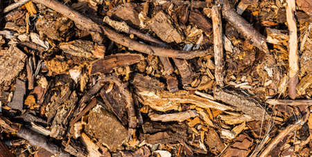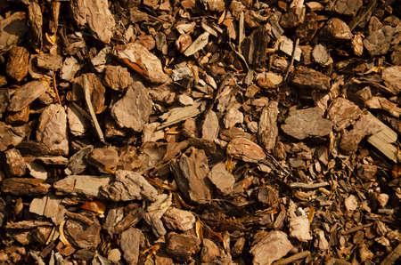 Crushed tree bark texture background closeup. Shredded brown tree bark for decoration and mulching or for playground.