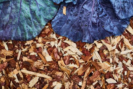 Textured background decorative colored sawdust for finishing flowerbeds in the winter season. Red and maroon sawdust