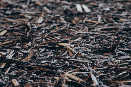 Natural bark used as a soil covered by morning frost, selective focus