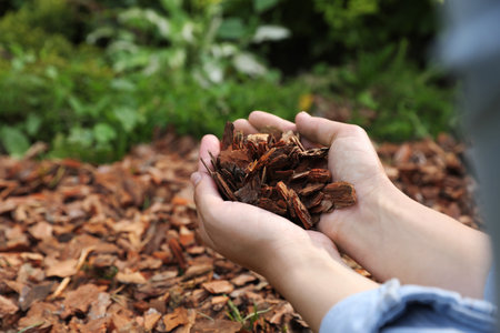Woman holding bark chips in garden, closeup. Space for text