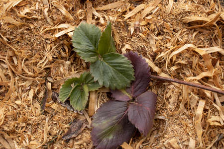 In autumn, green leaves of garden strawberries lie among the sawdust.