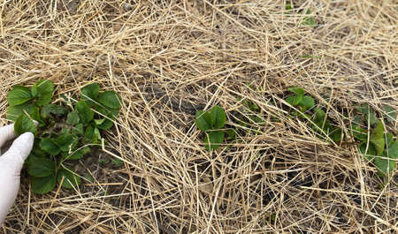 Onions grow in the garden under dry grass mulch. Gloved gardener lays raw materials for plants in organic farming.