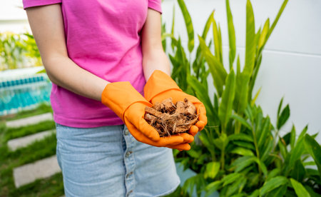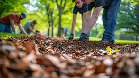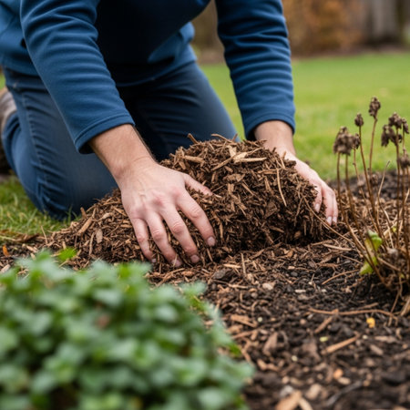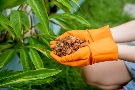 Hands mulching soil with bark chips in garden, mulch closeup, crushed wood pieces, blurred background, copy space for text, generative AI illustration