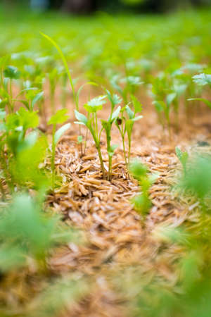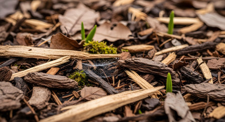 A low angle shot of young plants growing amongst wood chips in a forest.