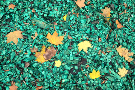Decorative wood chips with autumn leaves. The slivers are red, the leaves are yellow.