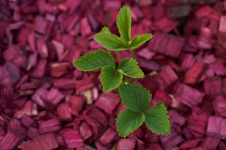 focus on green leaves with decorative red mulch under, note shallow depth of field