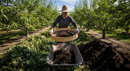 A woman works in a sunny orchard, using a round wooden sieve to sift rich, dark compost or soil into a wheelbarrow. Surrounded by fruit trees, the scene depicts organic gardening and soil preparation practices.