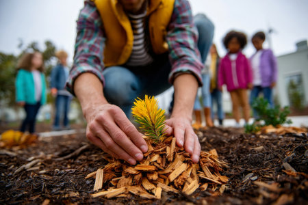 A teacher gently places mulch around a green plant while a group of diverse students watches, highlighting teamwork and environmental education.